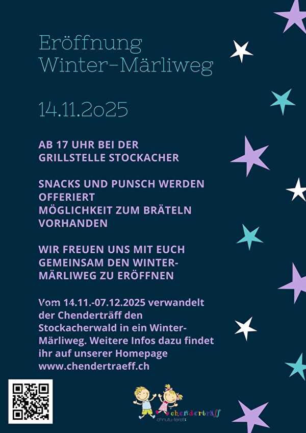 Eröffnung Wintermärliweg. Freitag 14.11.25 ab 17 Uhr bei der Grillstelle Stockacherwald. Punsch, Tee und Knabbereien werden vom Chenderträff offeriert. Es wird ein gemütliches Beisammensein am Feuer. Wer möchte bringt etwas zum bräteln mit. Keine Anmeldung nötig. Bei sehr starkem Regen oder Sturm wird der Anlass ersatzlos gestrichen. Über die Durchführung werden wir auf der Homepage www.chendertraeff.ch informieren. Der Wintermärliweg wird vom 14.11 bis 7.12.25 begehbar sein. Die genaue Wegbeschreibung wird auf der Homepage www.chendertraeff.ch ab 13.11 ersichtlich sein.